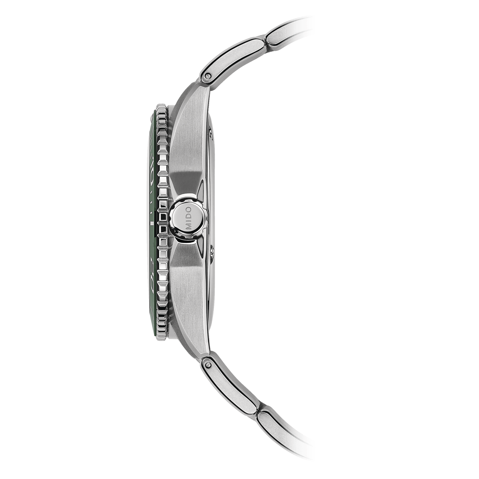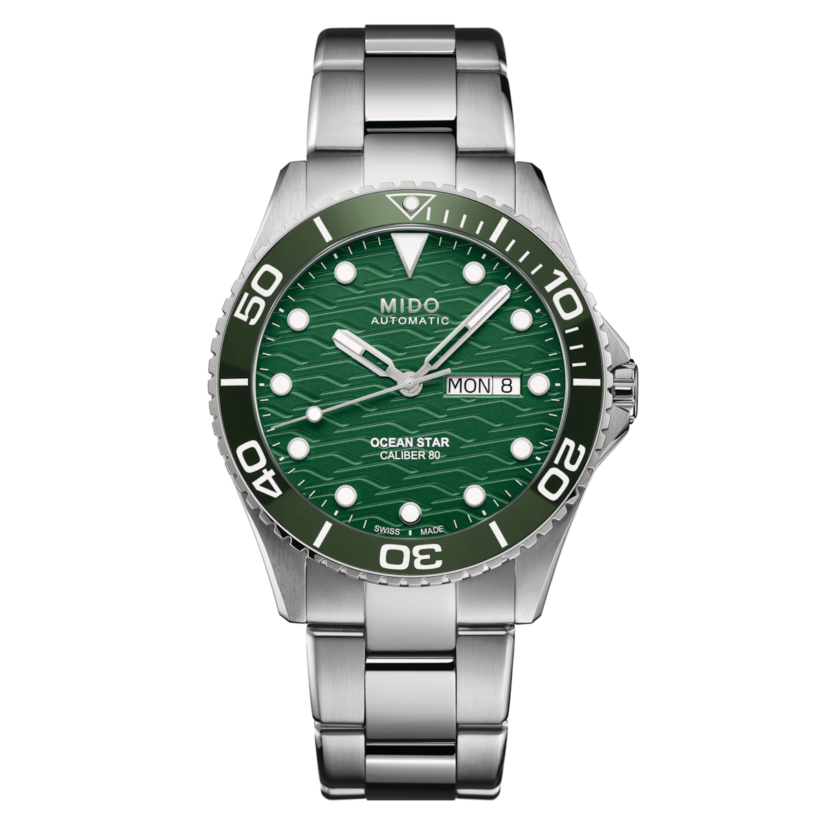 At the heart of the Ocean Star 200 is Mido's Caliber 80 automatic movement, known for its impressive 80-hour power reserve. This movement is engineered for longevity and precision, reducing the need for constant winding and ensuring consistent timekeeping. The watch’s clean, easy-to-read dial is complemented by Super-LumiNova-coated indices and hands, making it highly legible in low-light or underwater conditions. The date display at 3 o'clock adds a practical element to the watch, while the wave-patterned dial provides a subtle yet distinctive touch, connecting the design to Mido’s nautical heritage. The addition of a stainless steel bracelet with a folding clasp ensures comfort and security, making it an ideal companion for both active and everyday wear.