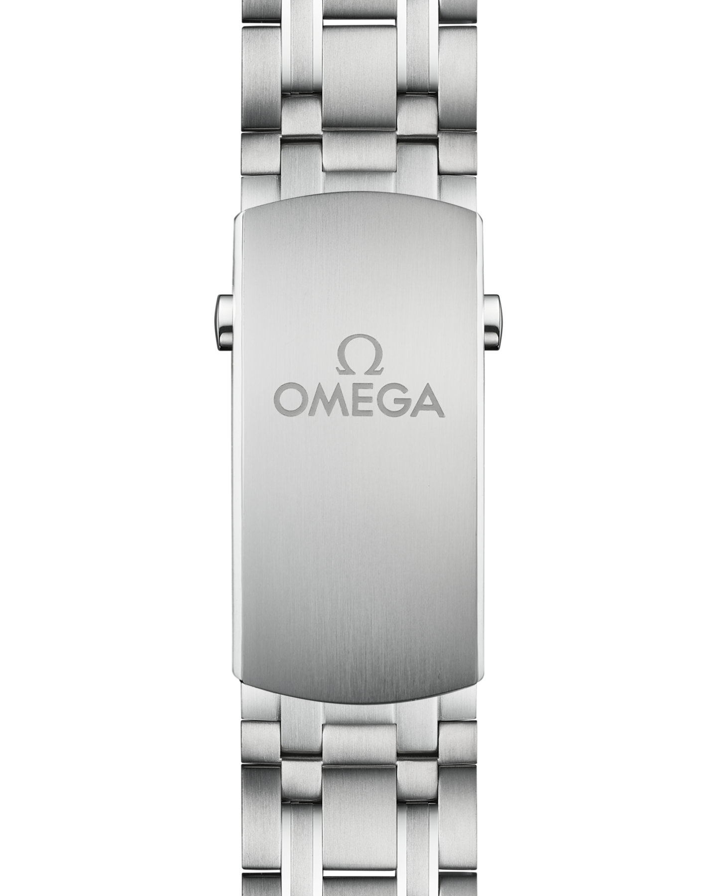 This model has a stainless-steel bracelet with OMEGA’s patented Quick-Change system and is presented in a commemorative blue box with red stitching.
