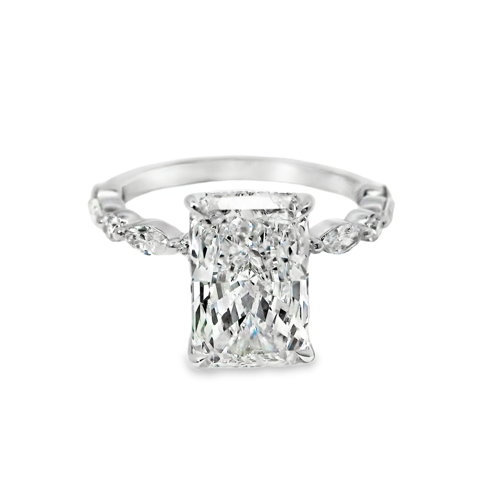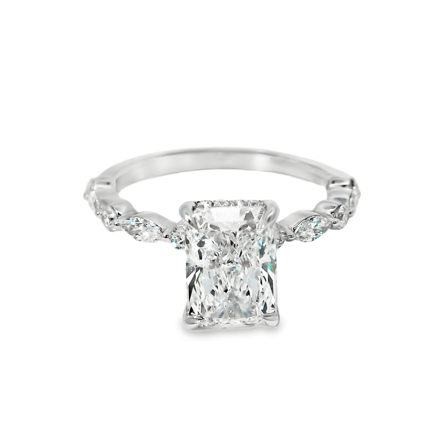 The modern and whimsical setting features a hidden halo that enhances the radiant diamond’s sparkle while maintaining a sleek silhouette. The band is thoughtfully adorned with alternating marquise and round diamonds extending halfway, adding a delicate, sophisticated touch that balances boldness with subtle elegance for a truly timeless symbol of love.
