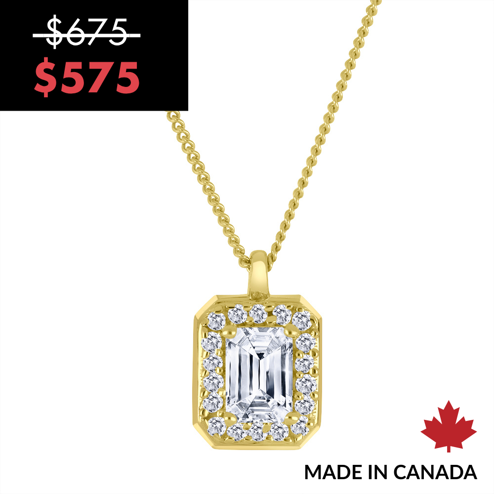 A symbol of timeless beauty and elegance, this stunning emerald cut halo necklace features a 0.32 total carat weight of lab diamonds. Set in luxurious 10K yellow gold, the necklace is designed around a brilliant emerald cut lab diamond at its centre, surrounded by 18 accent diamonds that form a sparkling halo.