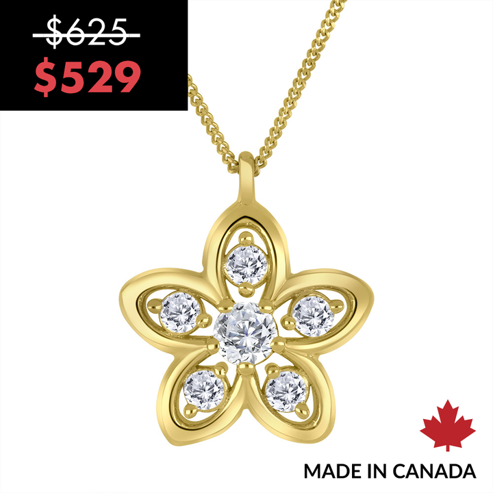 Delicate and sophisticated, this stunning pendant necklace in 10K yellow gold features a beautiful floral design that radiates elegance and charm. The centerpiece is a 0.29 total carat weight of six carefully set lab diamonds, arranged to form a graceful flower shape. With VS2 clarity and F colour diamonds, each stone displays superior brilliance and clarity, catching the light from every angle.