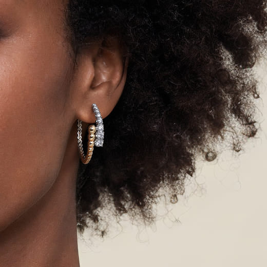 The 14k white and yellow gold Bujukan and graduating diamond bypass hoop earrings are a striking example of modern fine jewelry that blends sculptural design with refined elegance. Crafted in a two-tone combination of warm yellow gold and cool white gold, these hoops feature a graceful bypass silhouette that curves naturally around the ear. This flowing shape creates a sense of movement and sophistication, while the signature Bujukan detailing adds texture and depth to an otherwise sleek form.