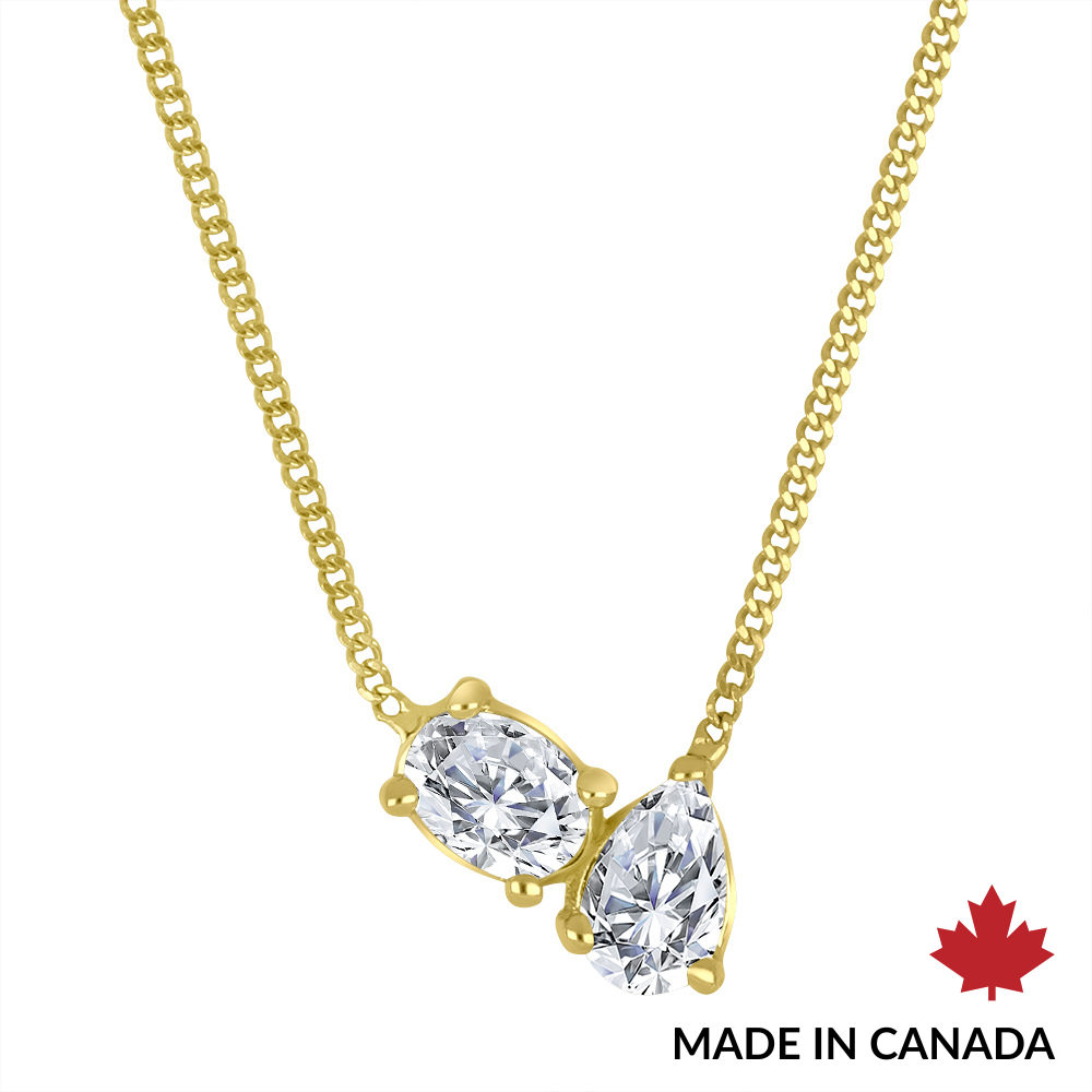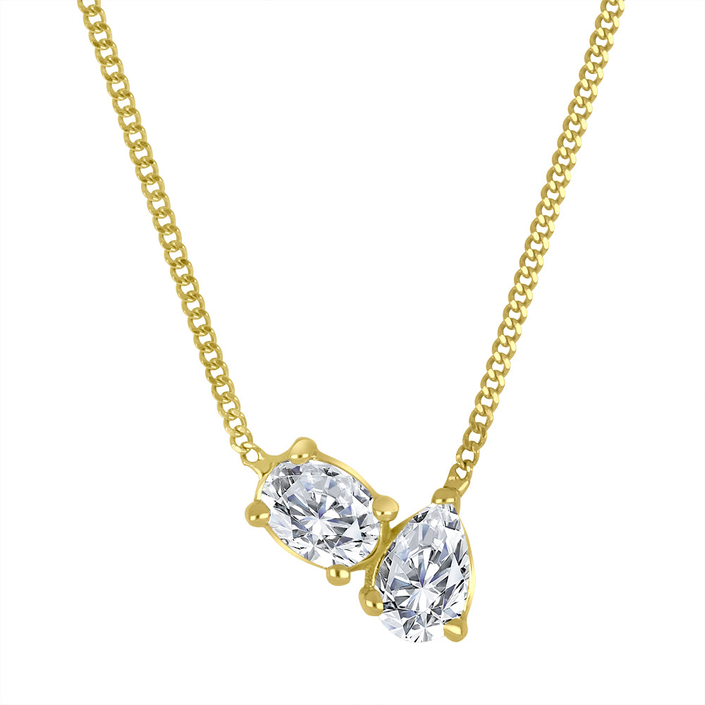 Embodying the essence of romance and unity, this Toi et Moi necklace in 10K yellow gold is a stunning symbol of connection. Featuring two exquisite lab diamonds—one oval cut and one pear cut—this design speaks to the complementary forces of love and harmony. With a total carat weight of 0.30ct, the diamonds shine with exceptional VS2 clarity and F colour, reflecting a brilliance that captures the eye and the heart.