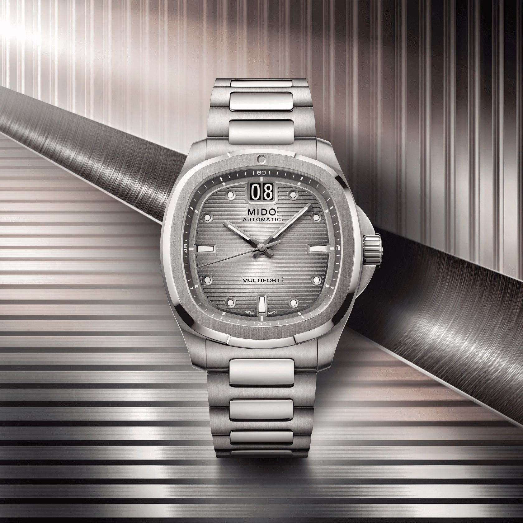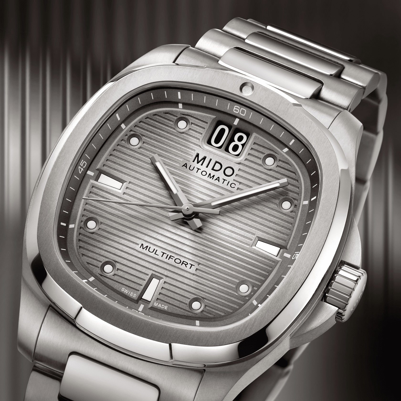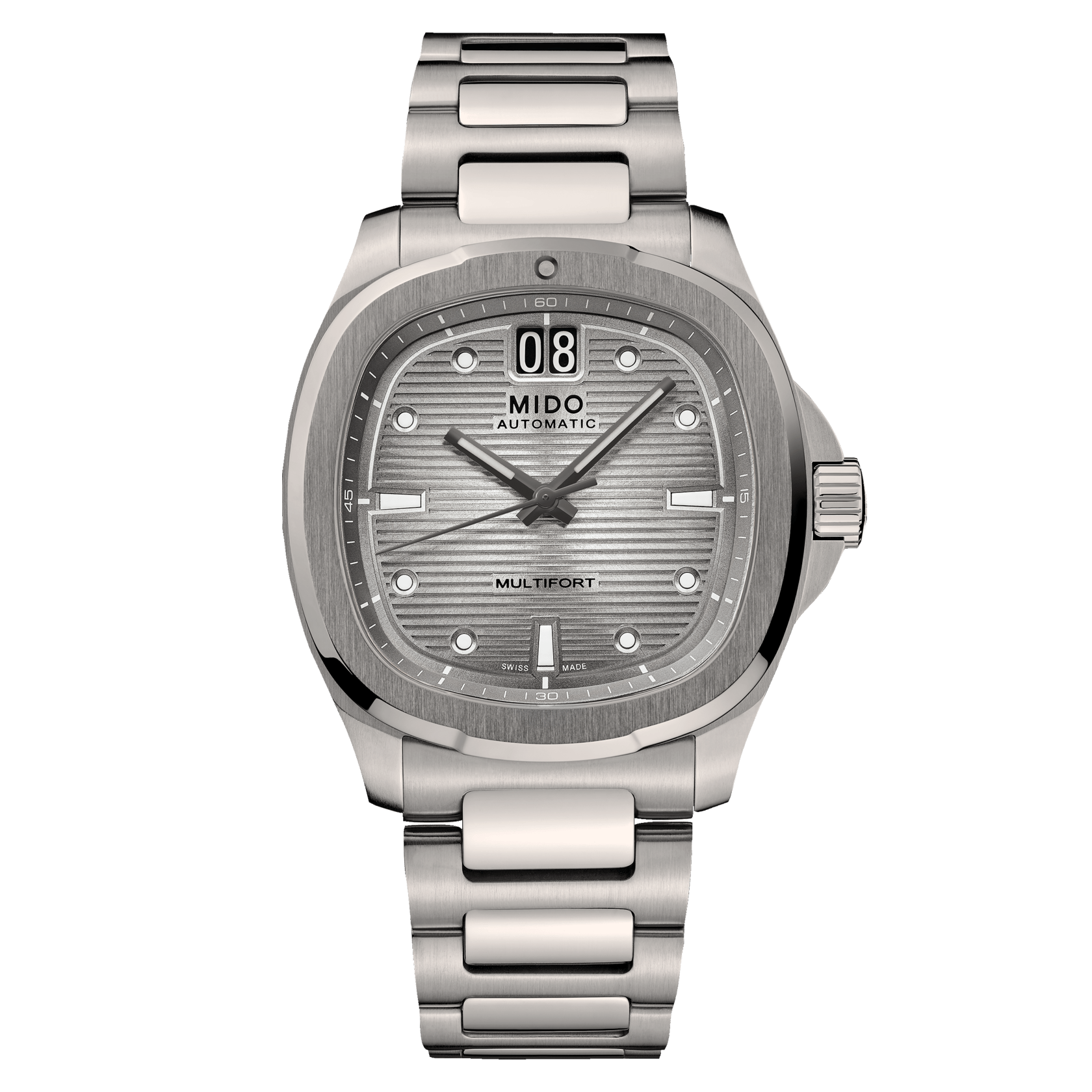 The MIDO Multifort TV Big Date Titanium 39.2 mm x 40 mm M049.526.44.081.00 combines heritage design with modern engineering, offering a sophisticated yet sporty aesthetic. Its distinctive TV-shaped case, crafted entirely in lightweight titanium, enhances comfort and durability while maintaining a refined presence on the wrist. The sunray anthracite dial adds depth and visual intrigue, perfectly contrasted by the large date aperture at 12 o’clock — a signature feature that amplifies both function and style. This model reflects MIDO’s commitment to combining Swiss precision with timeless aesthetics.