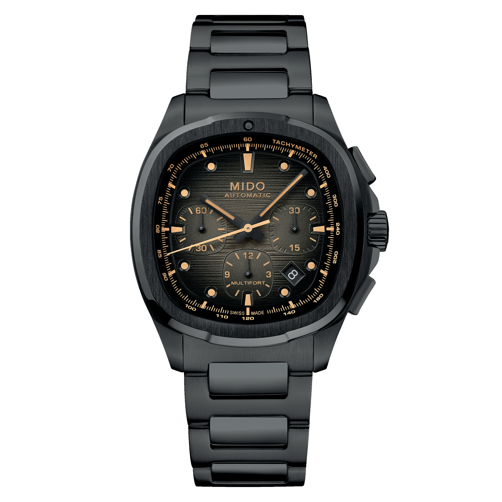 The MIDO Multifort TV Chronograph 41.2 x 42mm Special Edition M049.527.33.081.00 is a bold Swiss chronograph that combines vintage charm with modern sophistication. Featuring a distinctive TV-shaped stainless steel case with a sleek black PVD coating, this timepiece stands out as a modern reinterpretation of MIDO’s iconic Multifort design. Its horizontally brushed grey dial with contrasting chronograph counters and date display ensures excellent legibility, while the bold black finish enhances its sporty yet refined character. This Special Edition model is designed for those who want a chronograph that blends heritage, innovation, and exclusivity.