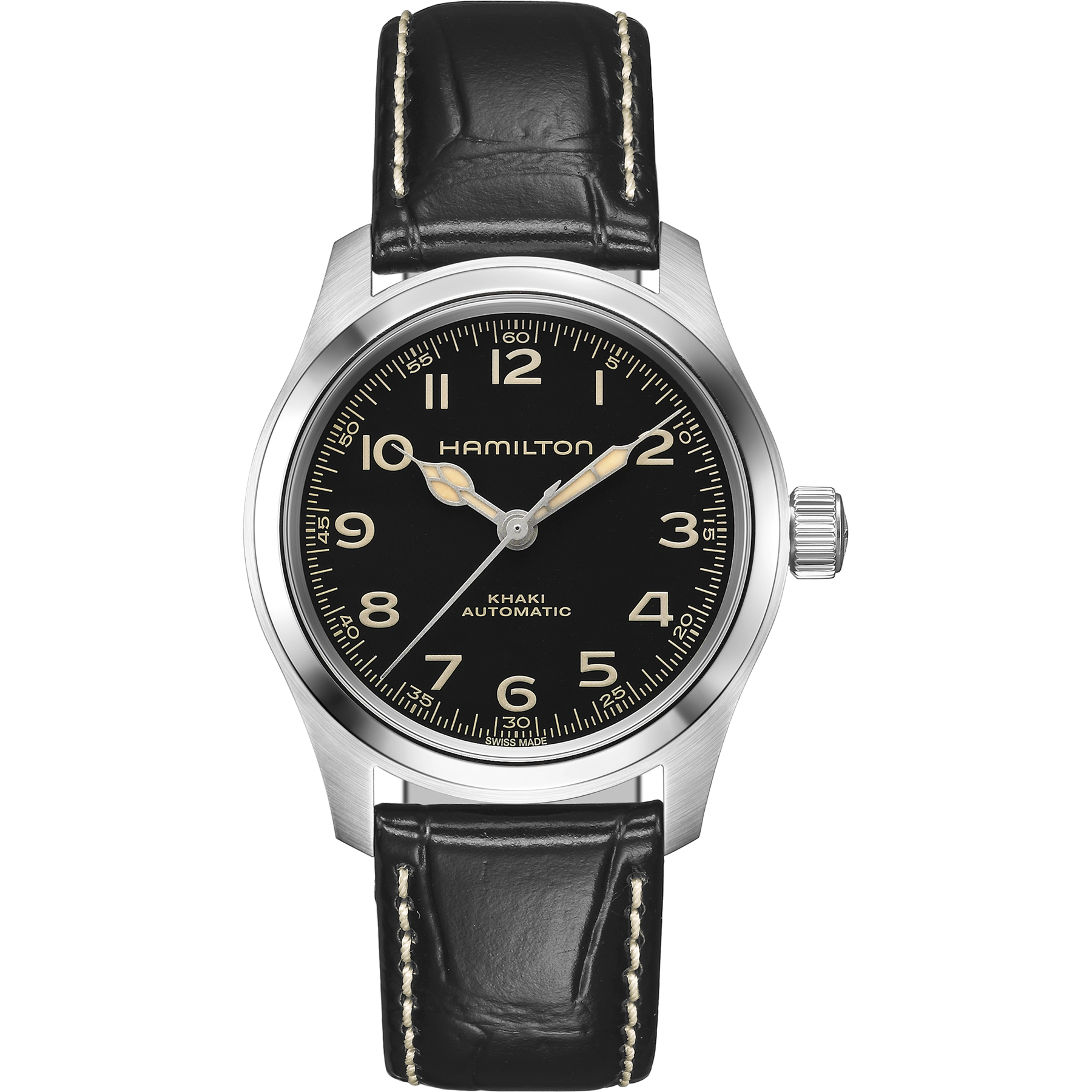 The Hamilton Khaki Field Murph Auto 38mm H70405730 is a sophisticated Swiss-made timepiece that seamlessly blends Hollywood heritage with exceptional watchmaking craftsmanship. Inspired by its legendary appearance in the movie Interstellar, this watch brings the beloved Murph design to a more compact and wearable 38mm case size. Crafted from premium stainless steel, the case offers a timeless and durable finish, perfect for both everyday wear and special occasions. The rich black dial is accented with vintage beige Super-LumiNova® hands and Arabic numerals, providing outstanding readability while evoking the charm of classic military field watches.