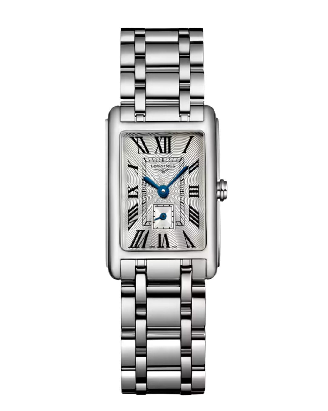 The Longines DolceVita 20.80 mm x 32 mm L5.255.4.71.6 is a refined rectangular timepiece that captures the spirit of timeless elegance. Inspired by the "sweet life" of Italian culture, this model stands out with its stainless steel case and beautifully proportioned dimensions, ideal for women who appreciate classic design in a smaller format. The silver flinqué dial features painted Roman numerals and blued steel hands, offering a crisp and sophisticated aesthetic that reflects Longines’ deep heritage in elegant watchmaking.