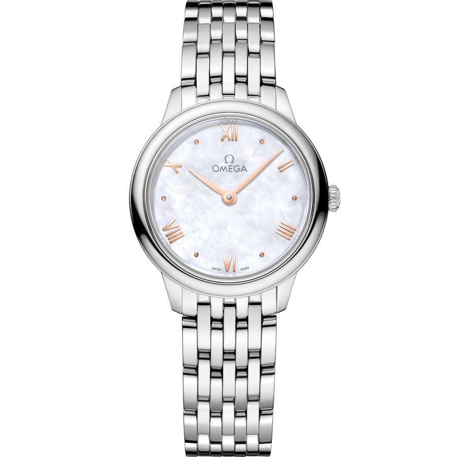 This model features a two-zone, white mother-of-pearl dial with Roman numeral hour indexes at the 3, 6, 9 and 12 o’clock positions. A scratch-resistant sapphire crystal covers this striking dial. The bezel is mounted on a 27.4 mm stainless steel case and is presented on a stainless steel bracelet. This wristwatch is powered by OMEGA’s calibre 1376, a precision quartz movement.