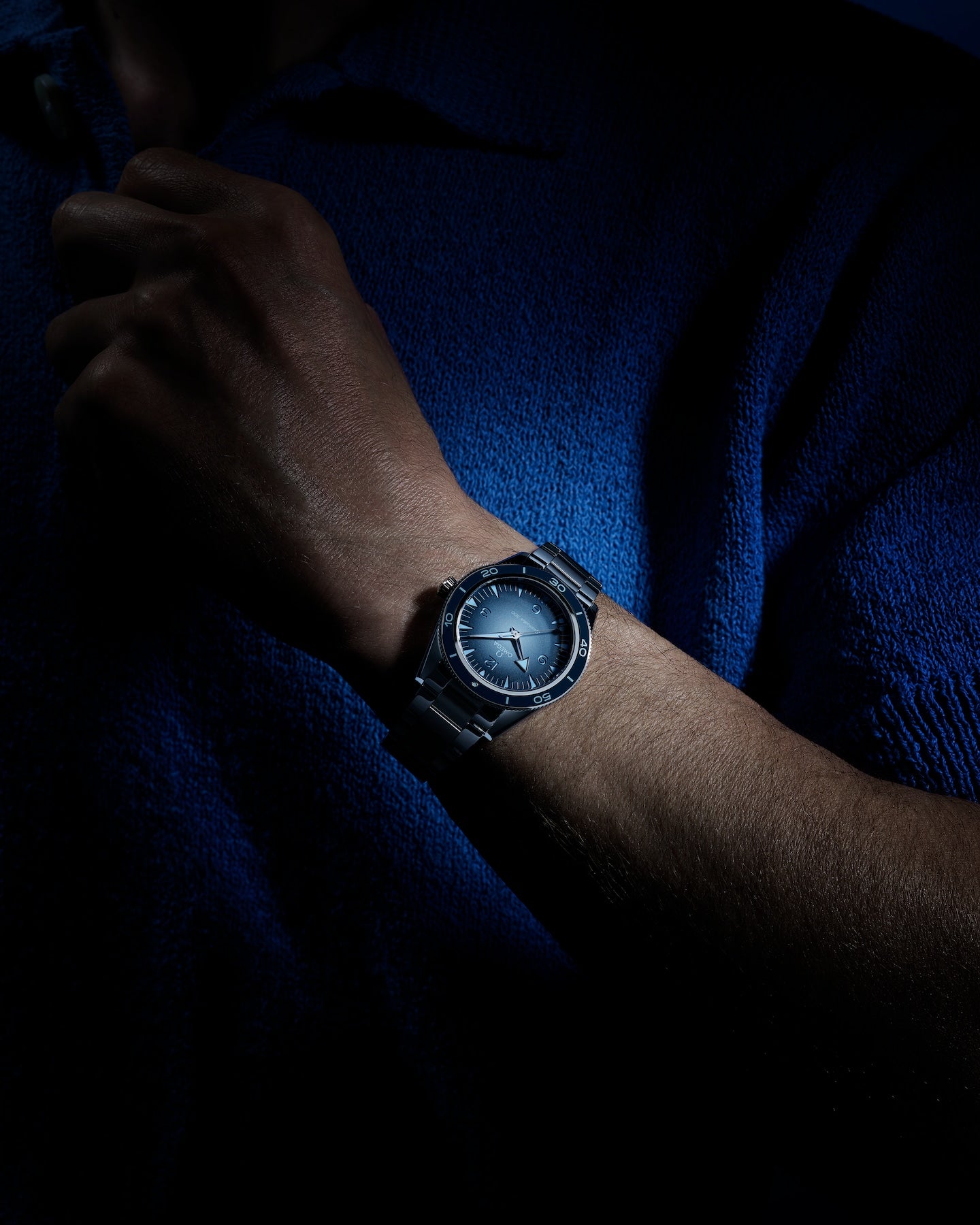 The varnished dial, in OMEGA’s own Summer Blue, has a gradient finish to reflect the watch’s level of water resistance. In keeping with the colour code, OMEGA has filled the rhodium-plated hands, recessed hour markers, and open numerals with a unique light blue Super-LumiNova.