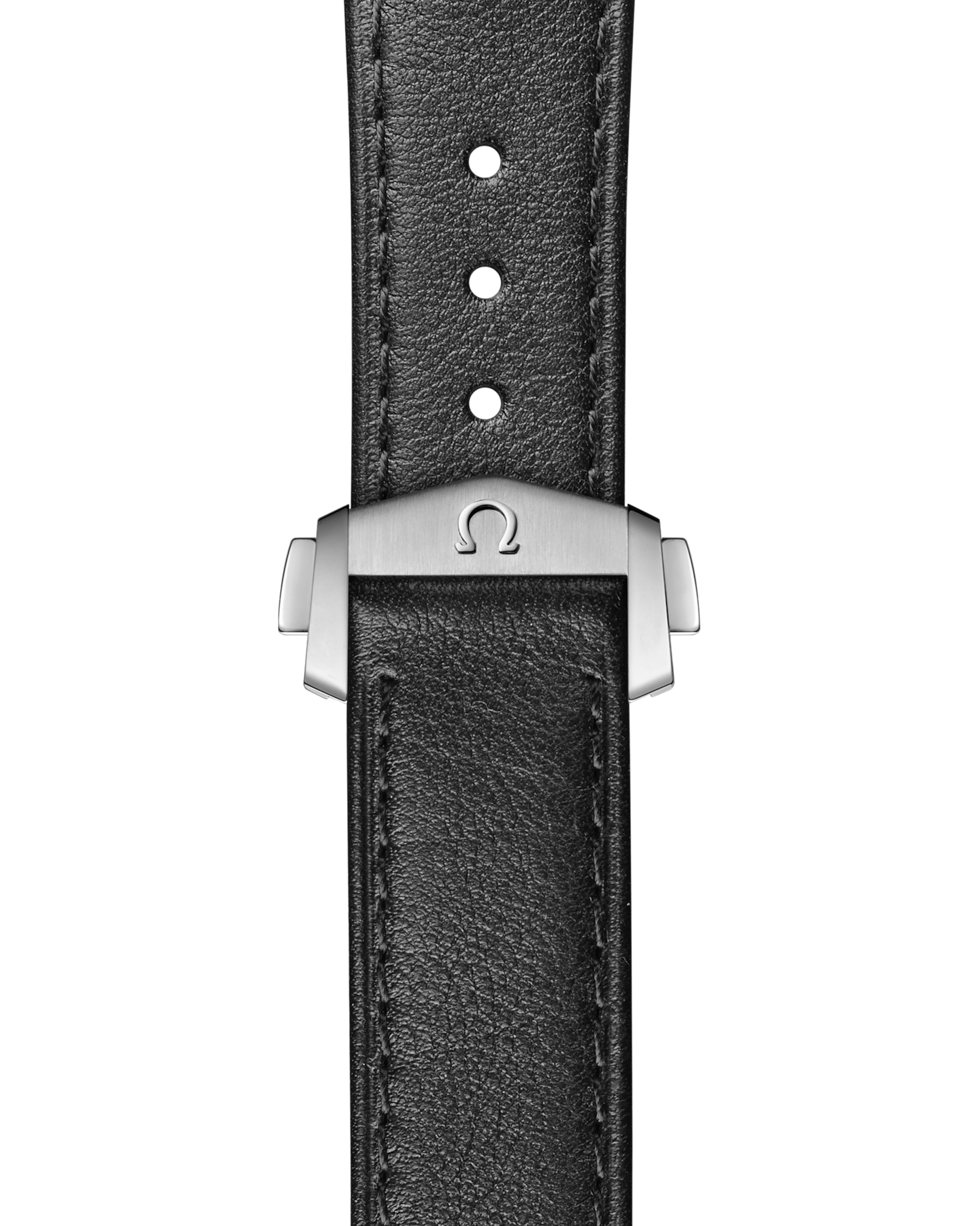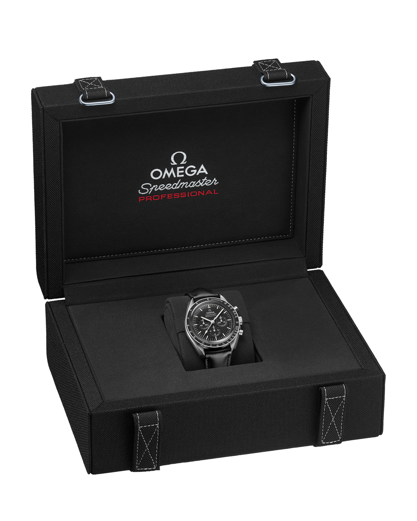 Presented on a black leather strap, this 42 mm Moonwatch in stainless steel features sapphire crystal glass on the front as well as on the caseback. Inspired by the 4th generation Speedmaster style worn on the moon, it also includes an asymmetrical case, black step dial with applied OMEGA logo and the famous dot over 90 on the anodised aluminium bezel ring.