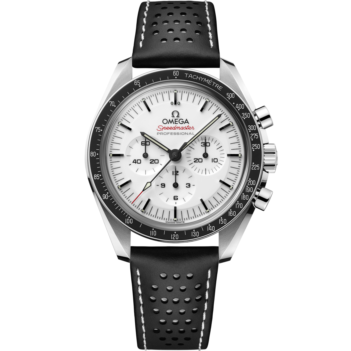 The OMEGA Speedmaster Moonwatch Professional 42 mm 310.32.42.50.04.002 offers a striking and contemporary take on the classic Moonwatch, featuring a crisp white lacquered dial with black subdials for a bold “panda” look. This version stands out with a black micro-perforated leather strap, giving it a refined yet sporty character. Housed in a 42 mm stainless steel case with the iconic asymmetrical shape, the watch remains true to the original design worn by NASA astronauts during lunar missions.