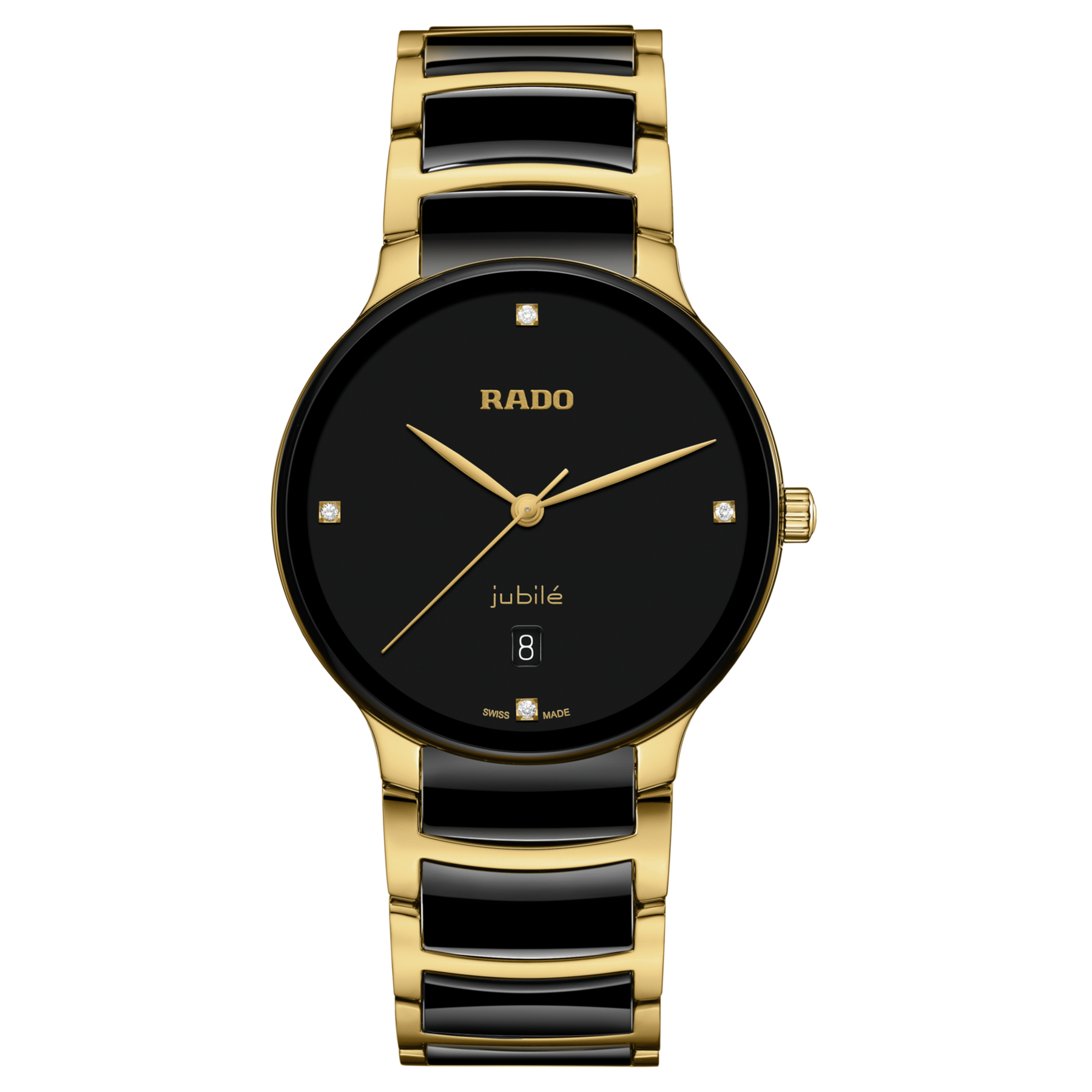 The Rado Centrix Quartz Diamonds 39.5 mm R30022712 is a refined timepiece that seamlessly combines Swiss precision with luxurious design. Encased in a 39.5 mm stainless steel case with yellow gold PVD coating, this watch features a striking black lacquered dial adorned with four diamonds, each meticulously set to enhance its sophisticated aesthetic. The dial's opulent appearance is complemented by gold-toned hands and the printed “jubilé” logo. Protected by a gently curved sapphire crystal with anti-reflective coating on both sides, the watch ensures optimal readability and durability. The bracelet combines polished yellow gold PVD-coated stainless steel and black high-tech ceramic links, offering a comfortable fit and a cohesive, contemporary look.