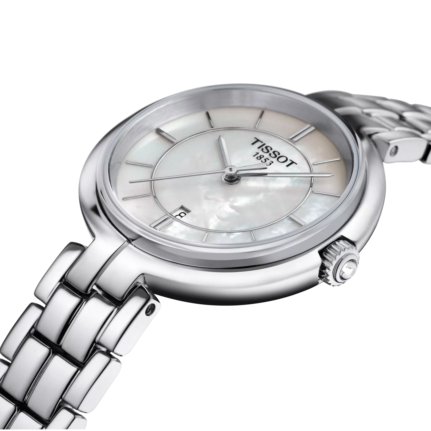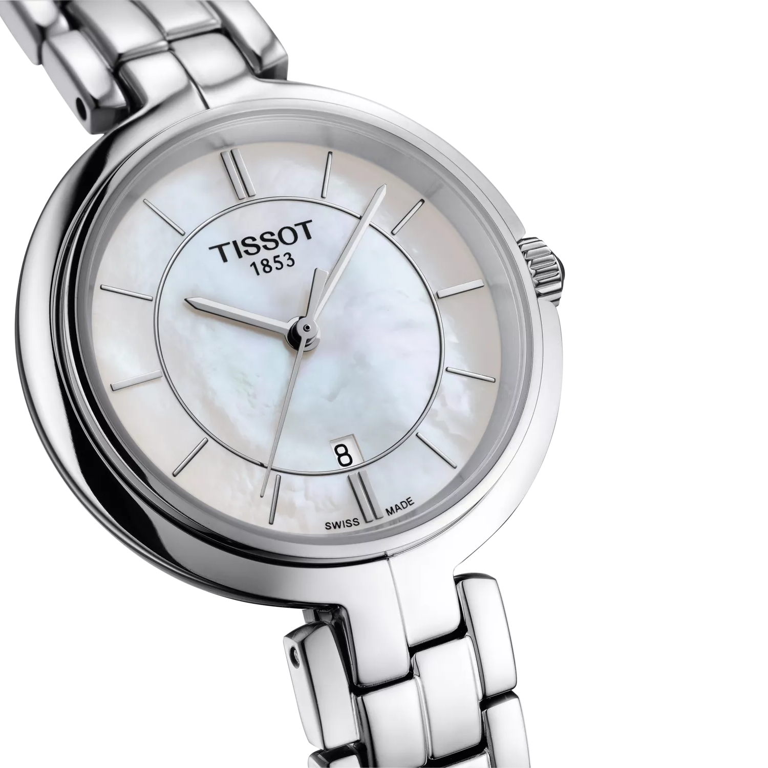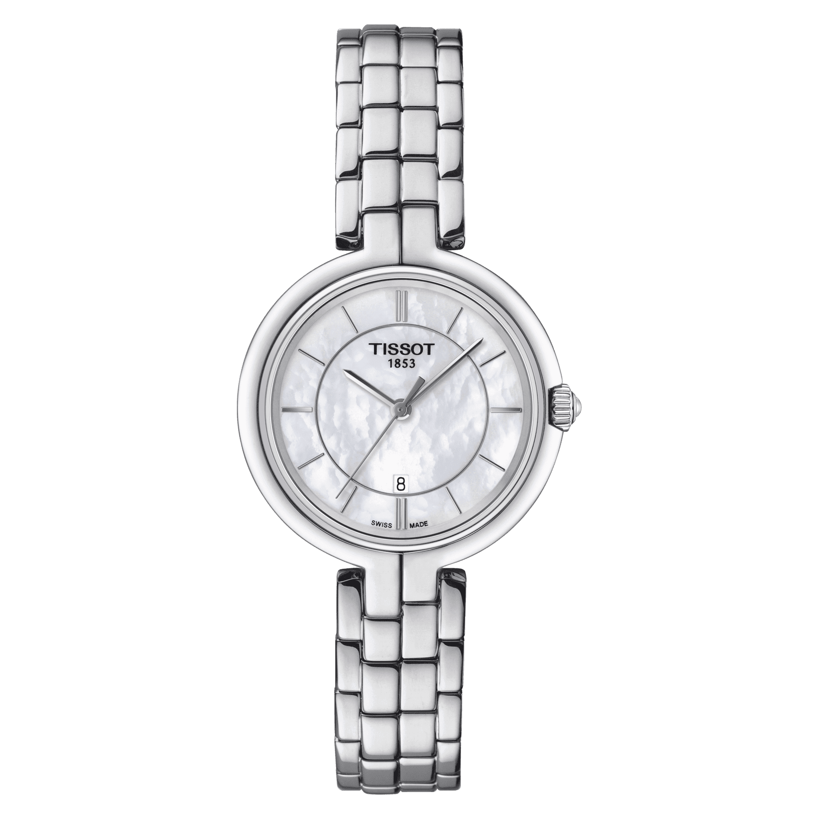 The Tissot Flamingo 30 mm (Ref. T094.210.11.111.00) is a beautifully elegant ladies’ watch that combines Swiss precision with minimalist sophistication. Designed with a sleek 30 mm stainless steel case, this model is perfect for those searching “ladies’ Swiss watches with mother-of-pearl dial” or “Tissot Flamingo stainless steel watch.” Its standout feature is the iridescent white mother-of-pearl dial, which adds a touch of luxury and individuality to each piece, while the slender hands and indexes enhance the feminine aesthetic.