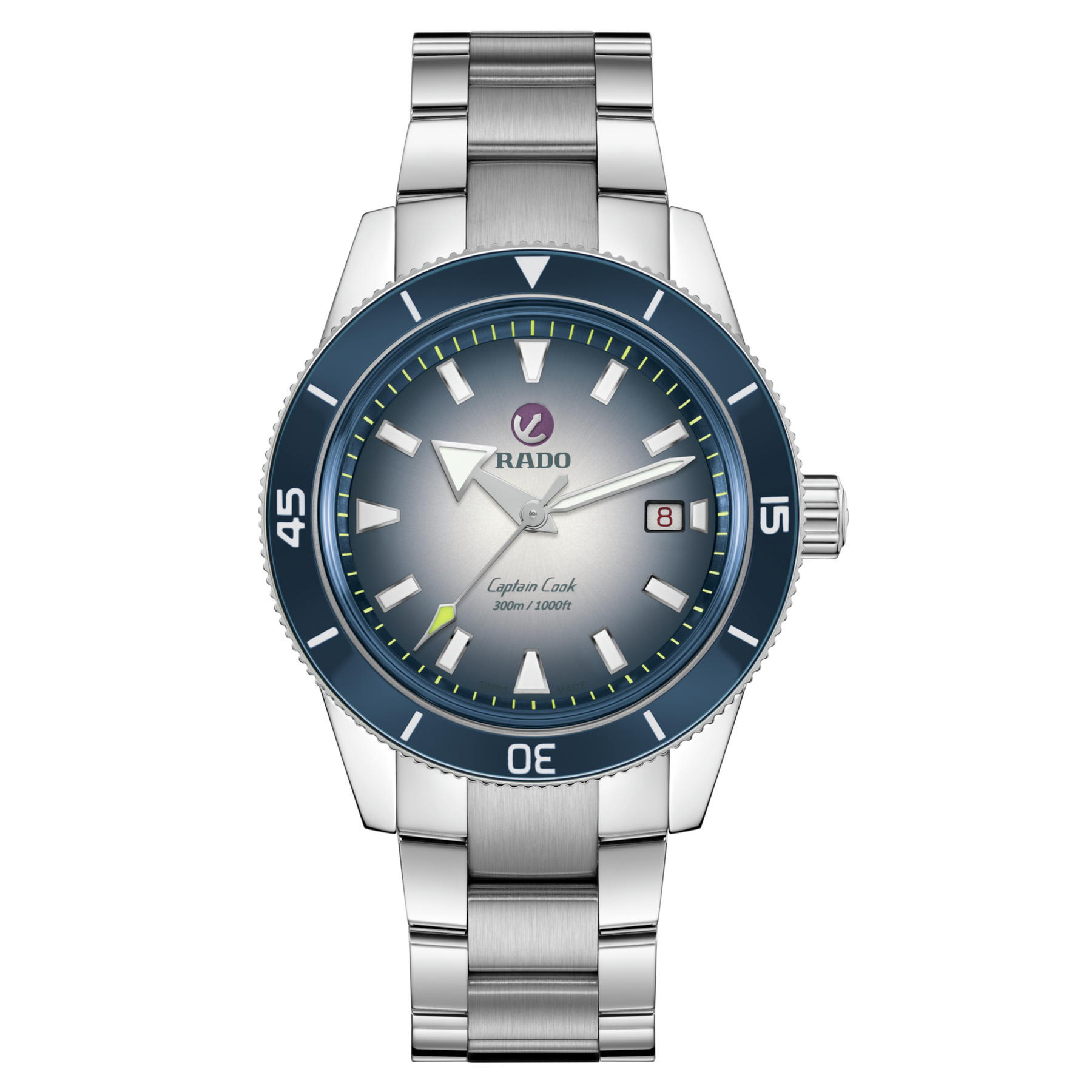The Rado Captain Cook Automatic 42 mm R32154208 is a distinguished men's watch that masterfully blends vintage aesthetics with modern Swiss engineering. Housed in a polished stainless steel case, this timepiece features a blue-to-white gradient dial that evokes the depths of the ocean. The dial is complemented by a polished stainless steel rotating bezel with a blue high-tech ceramic insert, engraved with white Super-LumiNova® markers, ensuring legibility in low-light conditions. The watch's design is further enhanced by rhodium-plated hour and minute hands, with the central seconds hand tipped in yellow Super-LumiNova®, adding a subtle nod to the brand's playful design elements.