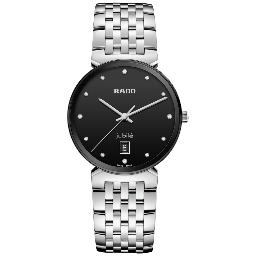 The Rado Florence Quartz Diamonds 38 mm R48912733 is a distinguished women's timepiece that masterfully combines classic Swiss design with contemporary elegance. Encased in a 38 mm polished stainless steel case, this watch features a black sunray dial adorned with 12 diamonds, each carefully set to enhance its sophisticated aesthetic. The rhodium-colored hands and the printed "jubilé" logo further accentuate its refined appearance. Protected by an edge-to-edge beveled, curved sapphire crystal, the dial offers clarity and durability.
