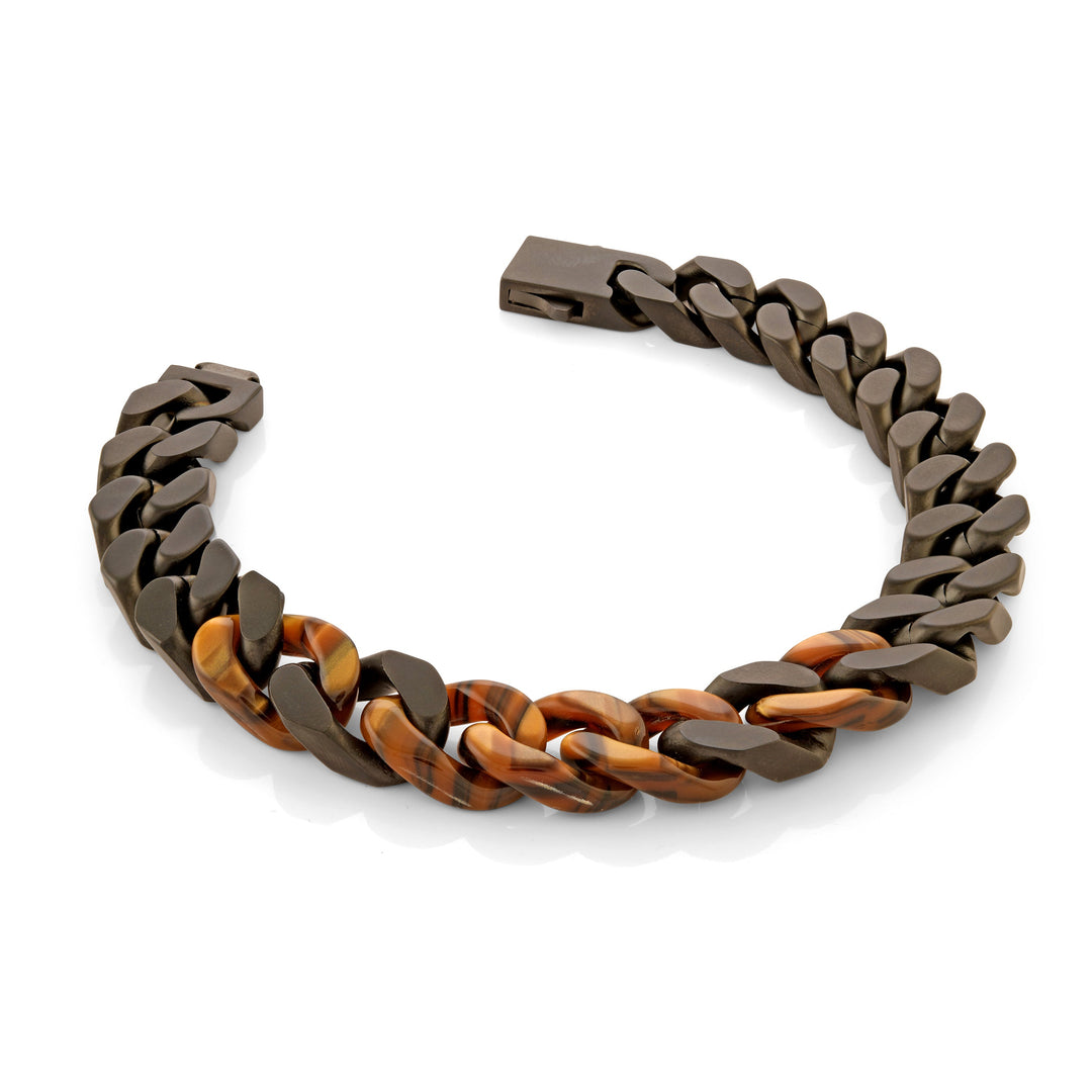 This stylish 10mm curb link bracelet is fashionably designed using ion-plated stainless steel and tiger's eye acetate for a unique, standout look. Enjoy wearing this luxurious and elegant bracelet every day and look amazing with its eye-catching design!