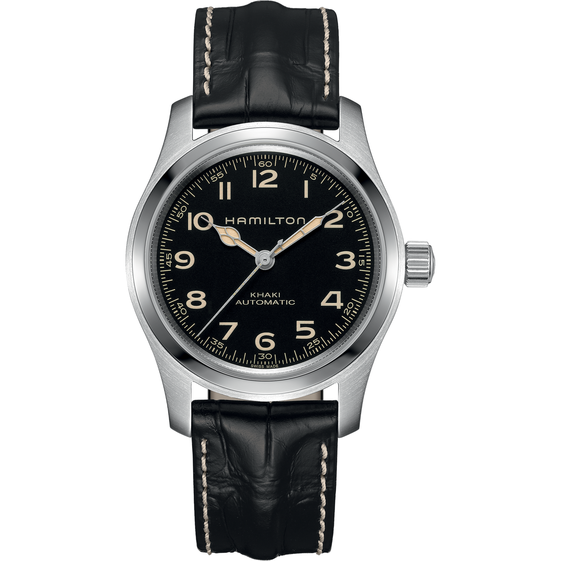 powered by the hamilton calibre h-10 automatic movement, the khaki field murph offers an impressive 80 hour power reserve and enhanced accuracy thanks to its advanced balance spring technology. protected by a sapphire crystal and built with a solid stainless steel case, this automatic watch is designed for durability and long term reliability. the bundle configuration adds extra value by including both a stainless steel bracelet and a black leather strap, allowing easy style transitions from rugged to refined.