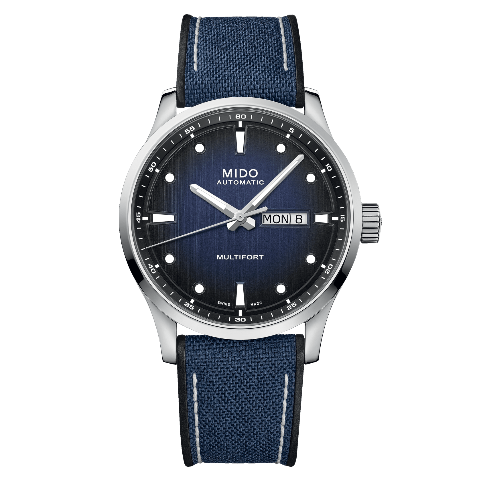 The Mido Multifort M 42 mm M038.430.17.041.00 is a stylish Swiss-made timepiece that combines classic design with modern technology. Its 42 mm stainless steel case features a brushed and polished finish, housing a blue-to-black gradient dial with a vertical satin texture reminiscent of the Côtes de Genève pattern. The dial is adorned with applied indexes and skeletonized hands, all filled with Super-LumiNova®, ensuring excellent legibility in low-light conditions. A day-date complication sits at the 3 o'clock position, adding both functionality and balance to the design. The watch is complemented by a blue textile strap with a black rubber base, secured with a stainless steel pin buckle featuring white stitching that echoes the tones on the dial.