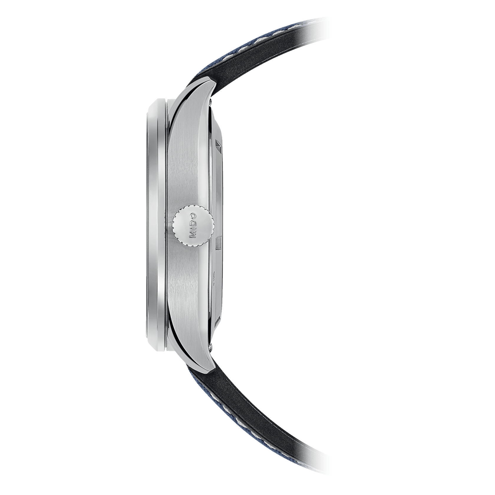 Powering this timepiece is the Mido Caliber 80 automatic movement, offering an impressive 80-hour power reserve—twice as much as a conventional movement. This movement incorporates a Nivachron™ balance spring, enhancing resistance to magnetic fields and shocks, thereby ensuring long-term precision and reliability. The watch also features a domed sapphire crystal with anti-reflective treatment on both sides, providing a clear view of the dial. With a case thickness of 11 mm and a water resistance of up to 100 meters, it is suitable for both daily wear and light aquatic activities.