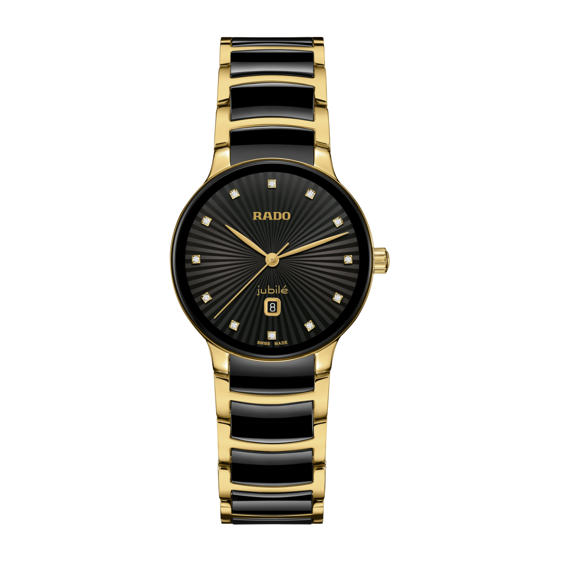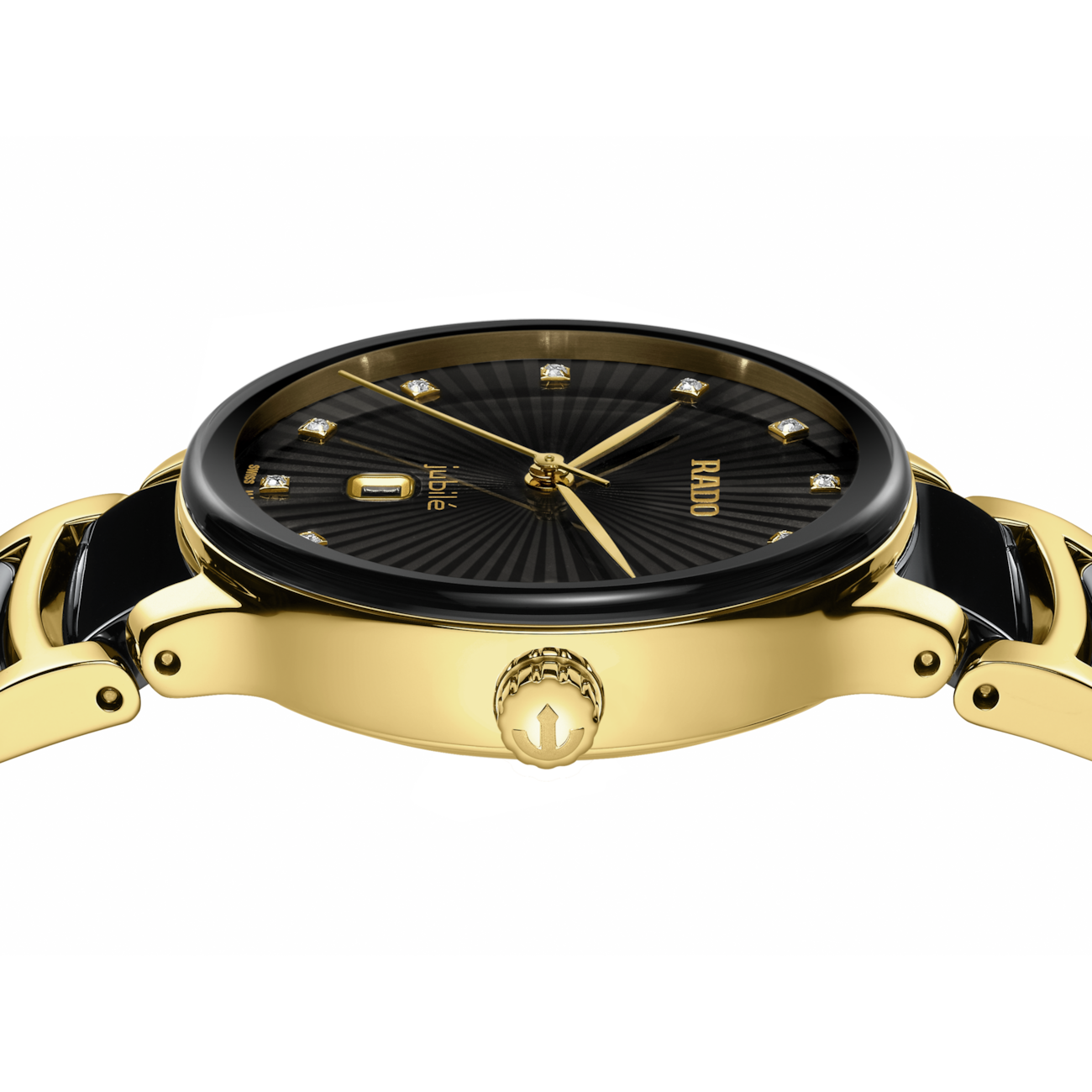 The Rado Centrix Quartz Diamonds 30.5 mm R30025742 is a sophisticated women's timepiece that seamlessly blends Swiss precision with luxurious design. Encased in a 30.5 mm stainless steel case with yellow gold PVD coating, this model features a black lacquered dial adorned with twelve diamond indices, adding a refined sparkle to the overall aesthetic. Gold-toned hands and a discreet date display at 6 o'clock complement the dial, while a gently curved sapphire crystal offers durability and excellent visibility. The bracelet combines polished yellow gold PVD-coated stainless steel with black high-tech ceramic links, delivering both elegance and comfort.
