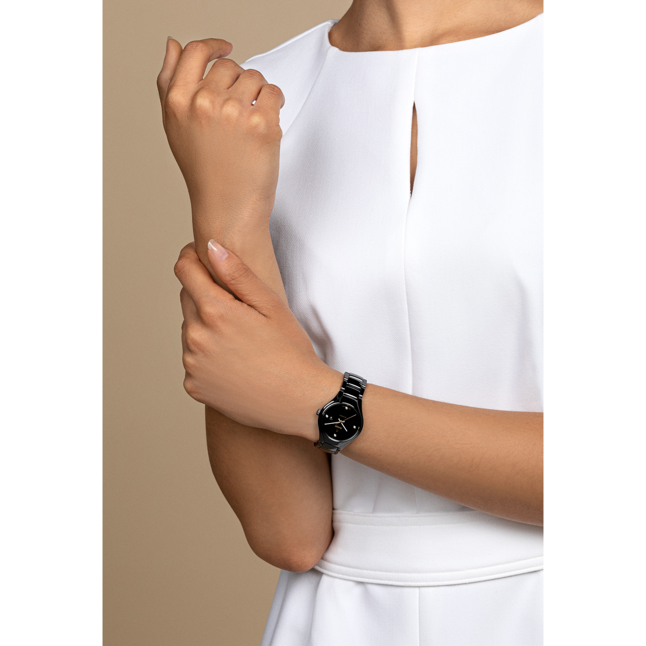 The Rado True Round Automatic Diamonds R27242712 is a luxurious and elegant timepiece designed for women who appreciate refined Swiss watchmaking. Featuring a 30 mm round case crafted from high-tech ceramic, this watch delivers exceptional durability and scratch resistance while maintaining a lightweight feel. The black dial is beautifully accented with four sparkling diamond hour markers, adding a touch of sophistication, while gold-tone hands provide clear readability. The sapphire crystal protects the dial, ensuring long-lasting clarity and resilience.