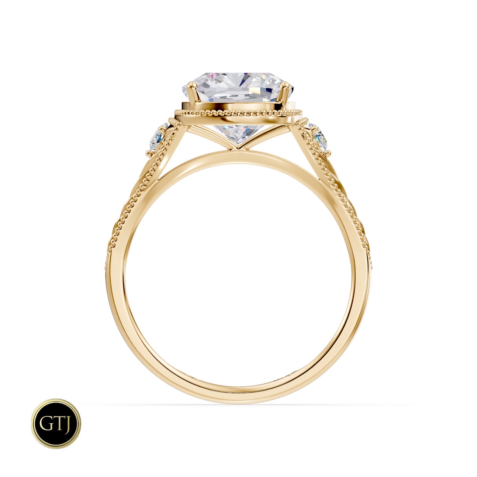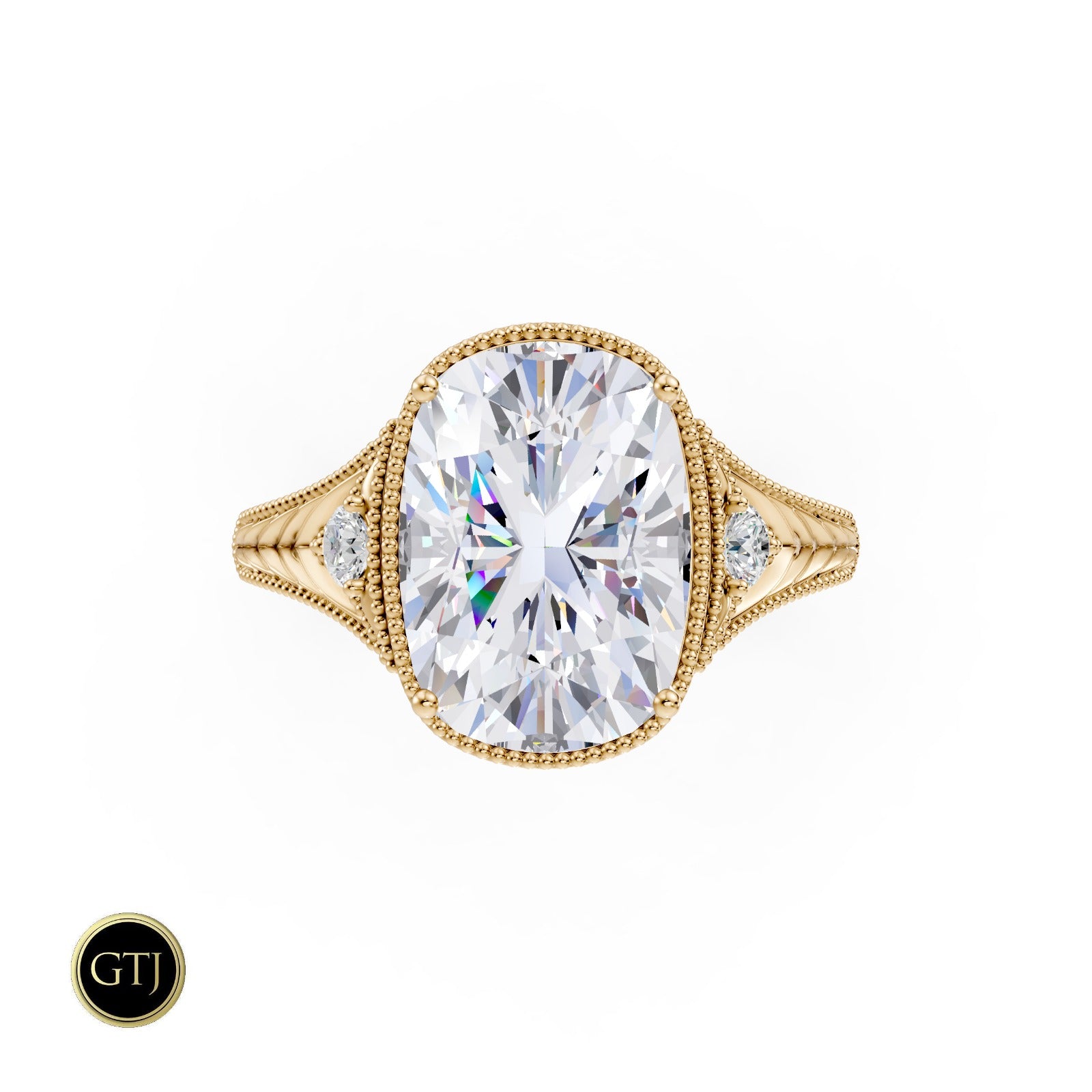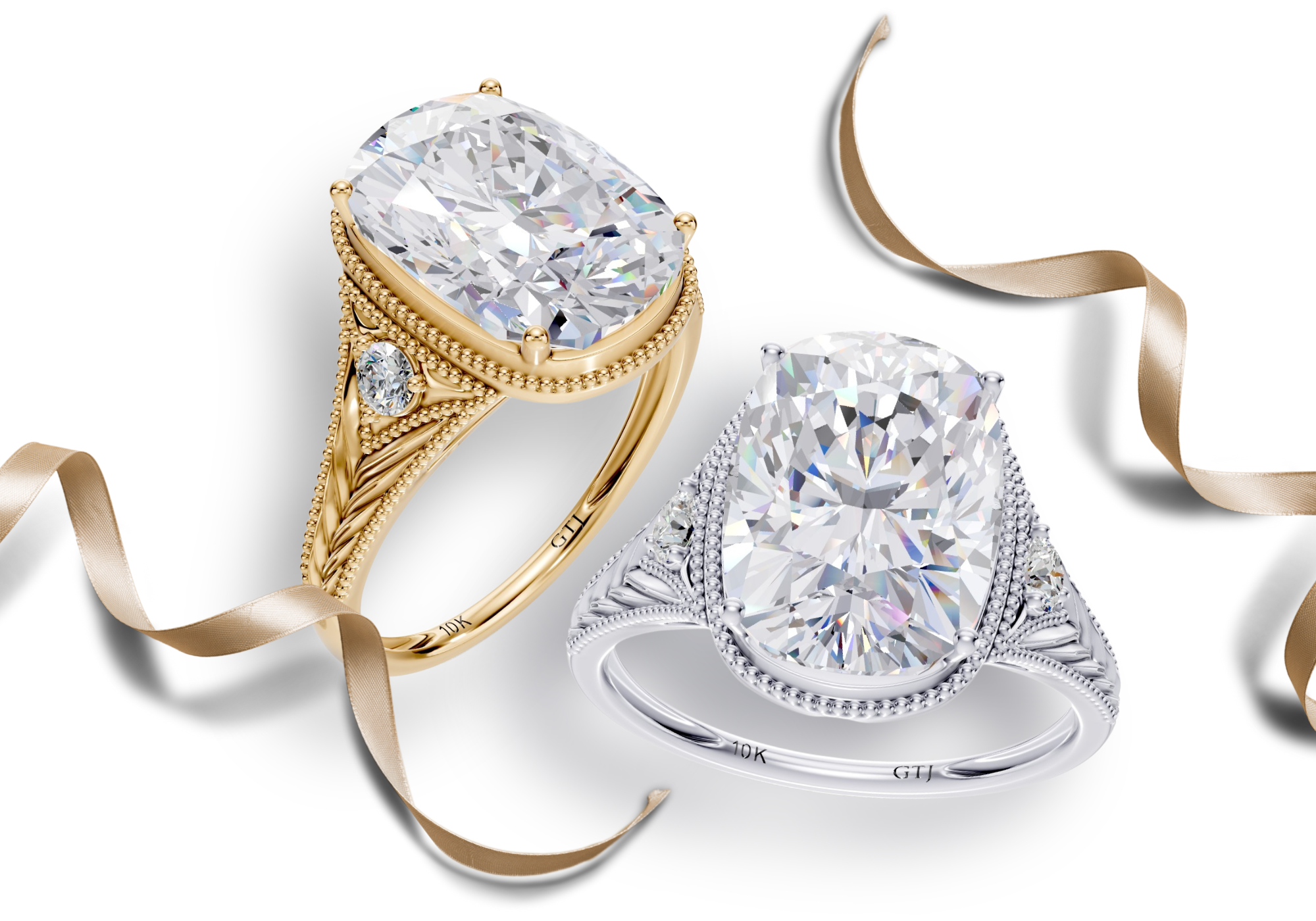 The 2025 Boxing Day Ring design is a Showgirl of a ring - featuring a dazzling elongated cushion cut Moissanite that resembles 6 carats in weight! From the custom antique shape to the carved floral motifs, this year’s exclusive design exudes Golden Era elegance. Available in your choice of 10 karat yellow or white gold.