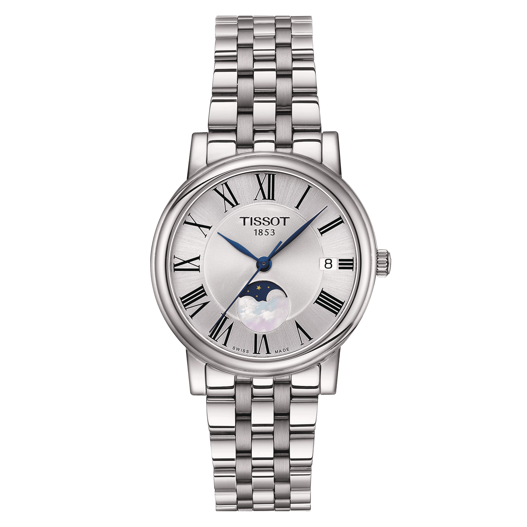 The Tissot Carson Premium Lady Moonphase 32 mm T1222231103300 is a refined timepiece that embodies elegance and precision. Featuring a polished stainless steel case and a sophisticated silver dial, this women’s watch is the perfect accessory for formal occasions or everyday elegance. The Moonphase complication at 6 o’clock adds a poetic touch to the dial, showcasing Tissot's expertise in blending functionality with timeless design.