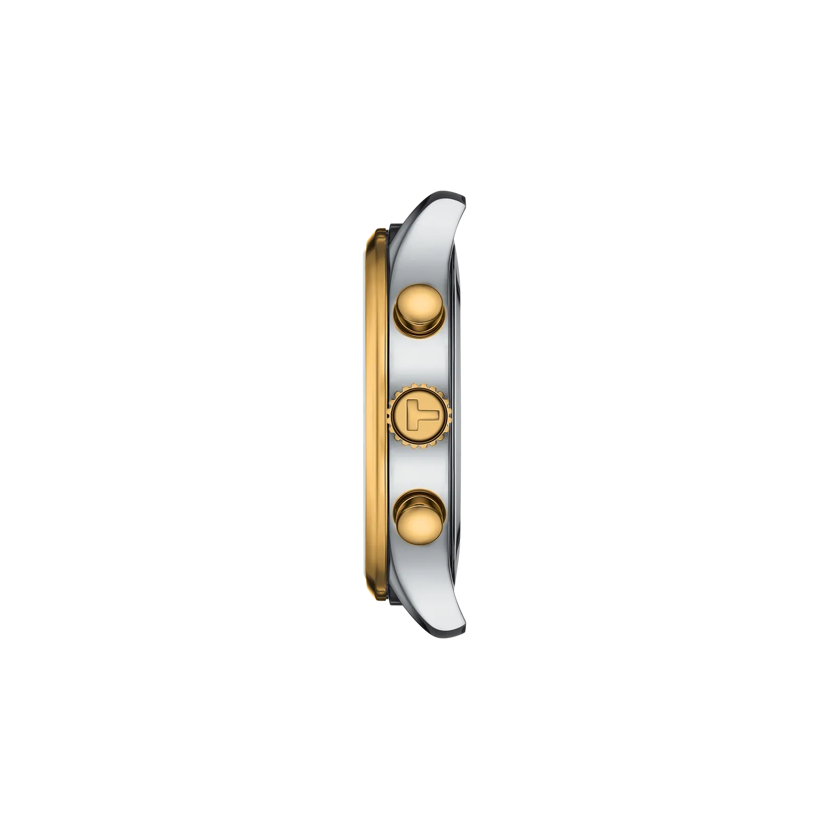 The Tissot Chrono XL Classic 45 mm T1166172204100 is a distinguished men's chronograph watch that combines bold design with Swiss precision. Featuring a substantial 45 mm case crafted from 316L stainless steel with a yellow gold PVD coating, this timepiece exudes a luxurious two-tone aesthetic. The deep blue dial is complemented by gold-tone hands and index markers, all treated with Super-LumiNova® for enhanced visibility in low-light conditions. Protected by a scratch-resistant sapphire crystal, the watch is designed to withstand daily wear while maintaining its elegant appearance.