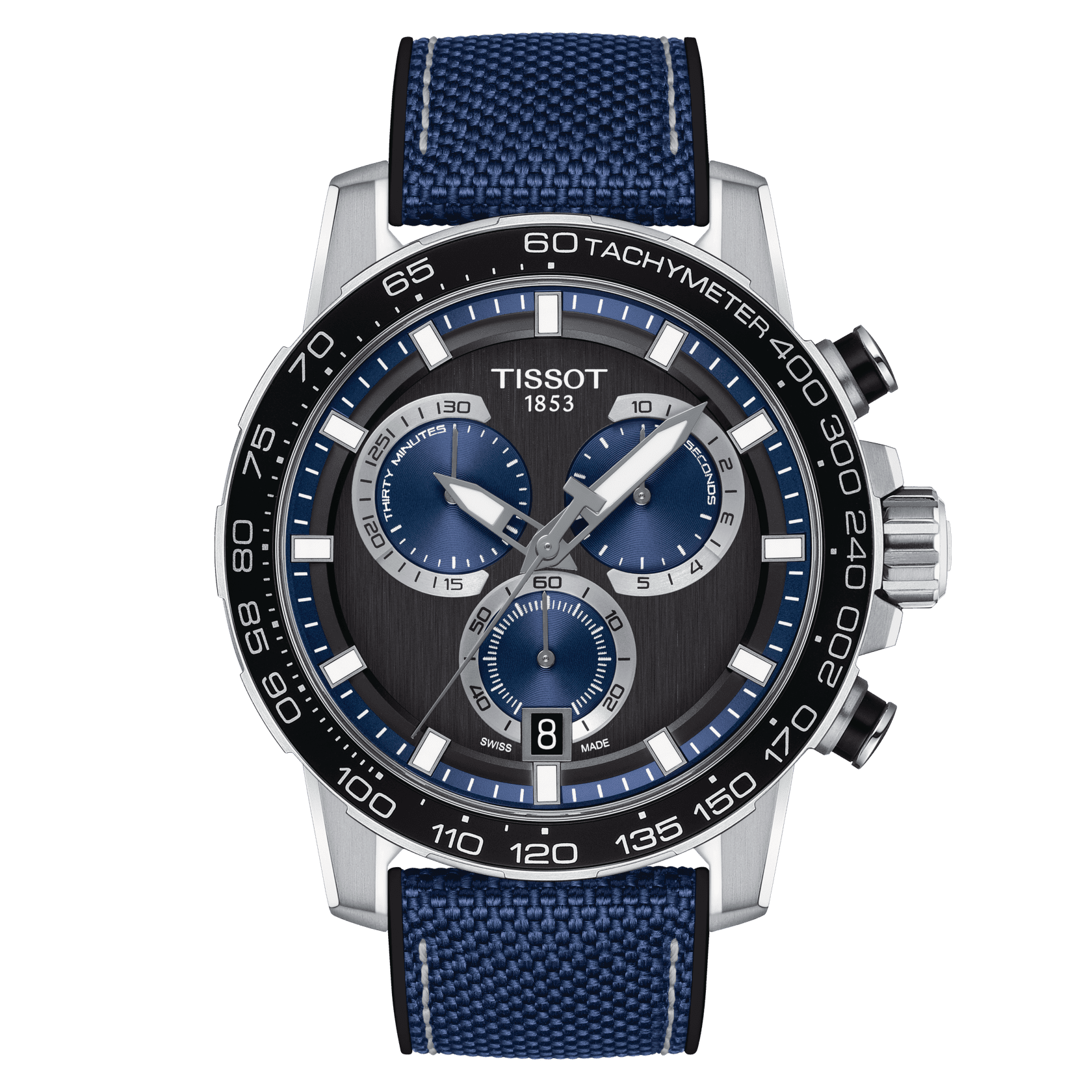The Tissot Supersport Chrono 45.50 mm is presented on a blue textile strap with contrasting white stitching, secured by a standard buckle. This strap not only adds to the watch's sporty appeal but also ensures comfort during wear. The interchangeable quick-release bracelet system allows for easy customization, enabling wearers to switch straps without the need for tools. Whether you're engaging in outdoor activities or attending a casual event, this timepiece offers both style and functionality, embodying Tissot's commitment to quality and innovation.