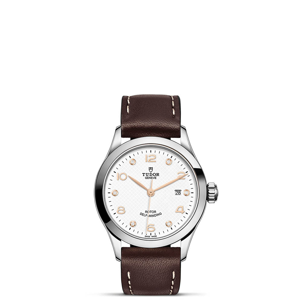 The TUDOR 1926 28 mm M91350-0014 is a sophisticated ladies' watch that blends timeless elegance with the brand’s commitment to quality craftsmanship. Housed in a polished 28 mm stainless steel case, the watch features a white embossed dial complemented by rose gold Arabic numerals and six carefully set diamonds, delivering a refined balance of beauty and readability. The domed shape of the dial and the smooth bezel enhance its classic appeal, while the date function at 3 o’clock adds practical functionality.